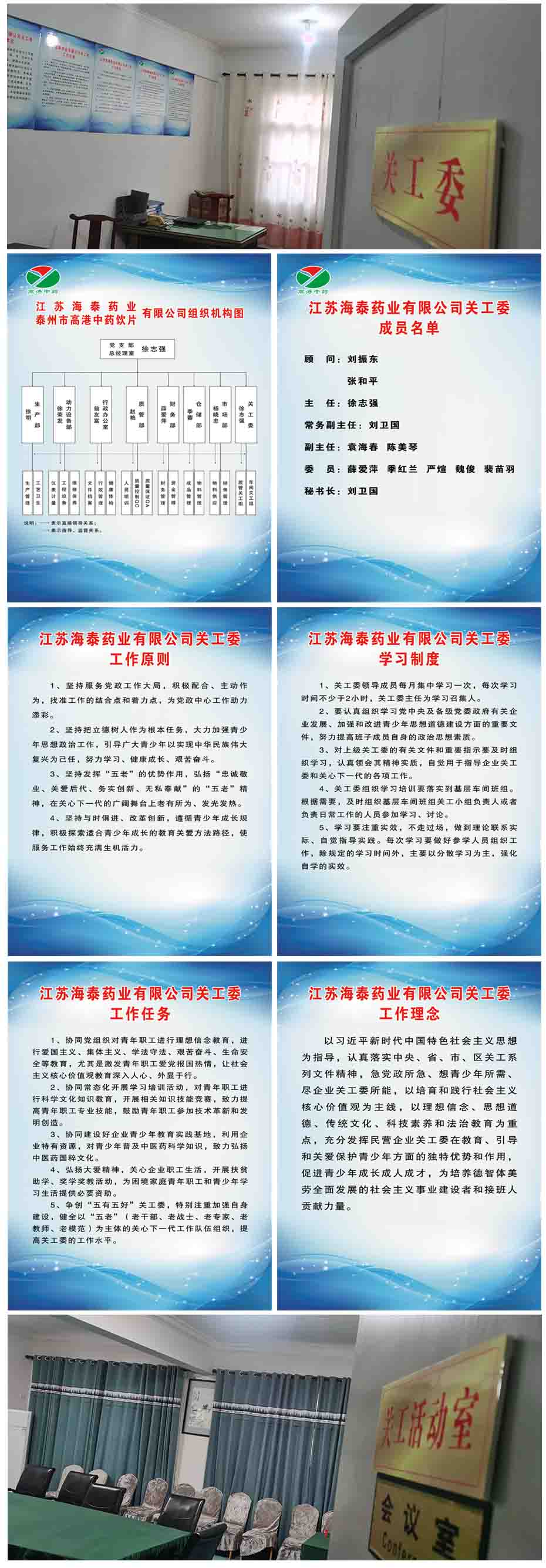 关工委组织机构健全,聘请上级关工委的两位领导为顾问;公司总经理徐志强任关工委主任,副总经理刘卫国任常务副主任兼秘书 长,另有2名副主任、5名委员。